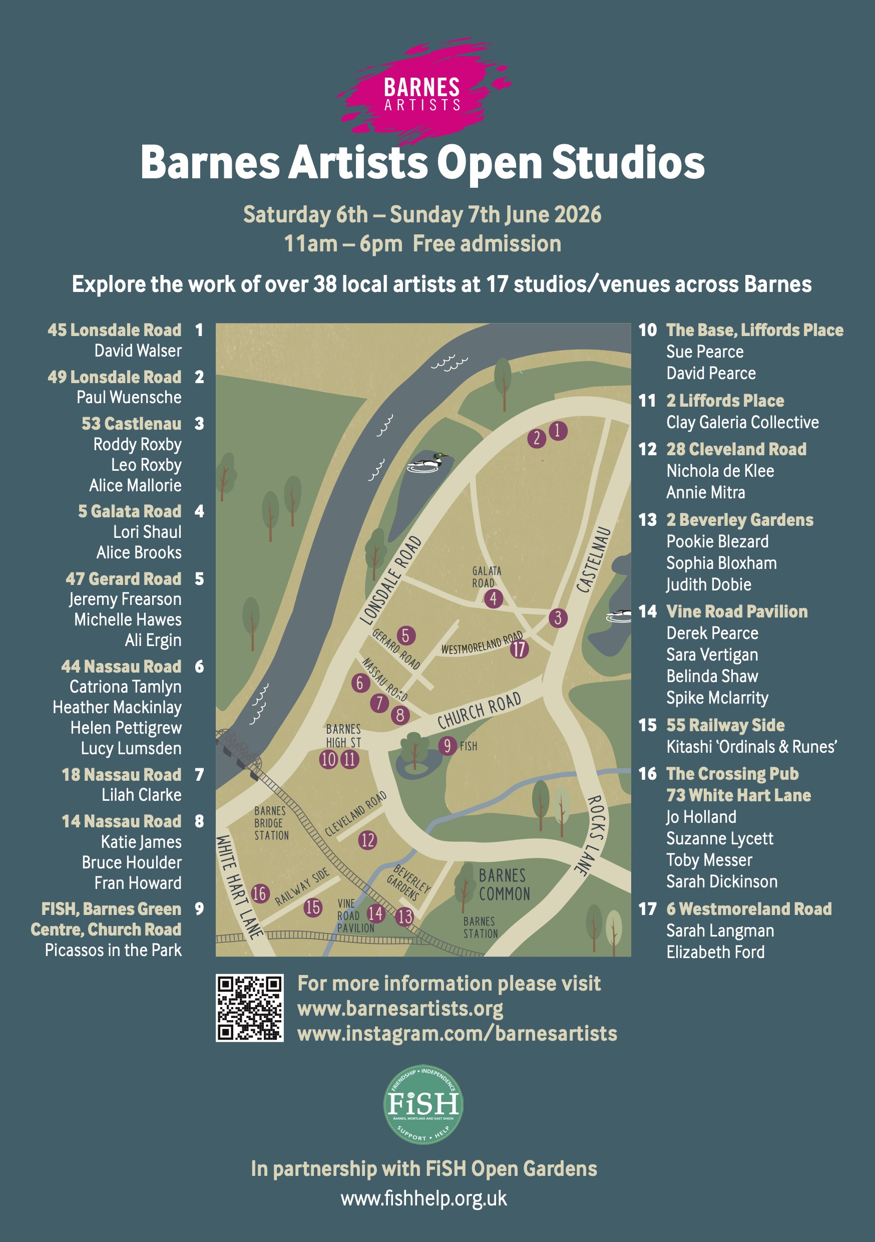 Barnes Artists are launching the first independent Open Studios event since local contemporary artist Bruce McLean held a Barnes Biennale in 2005. On Saturday 6th and Sunday 7th June, nearly 40 local artists offer a diverse collection of paintings, prints, photography, ceramics, sketches, sculpture, stained glass, performance art and demonstrations in 17 locations, all around the theme ‘From the Garden’. The free event is held in association with FiSH Open Gardens on Sunday 31st May 2026.